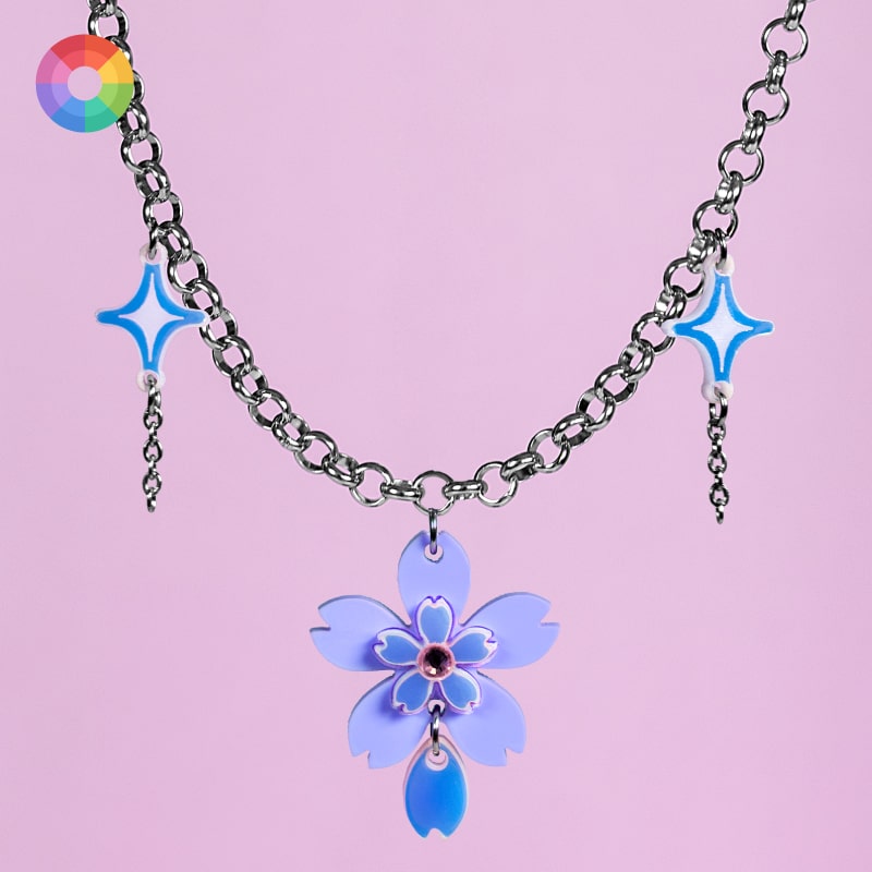 Ofrece la opción de personalización con dos tonalidades: rosa y lila, permitiendo que cada portador exprese su estilo único. Además, el pétalo inferior de la flor cuenta con un efecto holográfico deslumbrante, que añade un toque de magia y misterio a cada movimiento. ✨