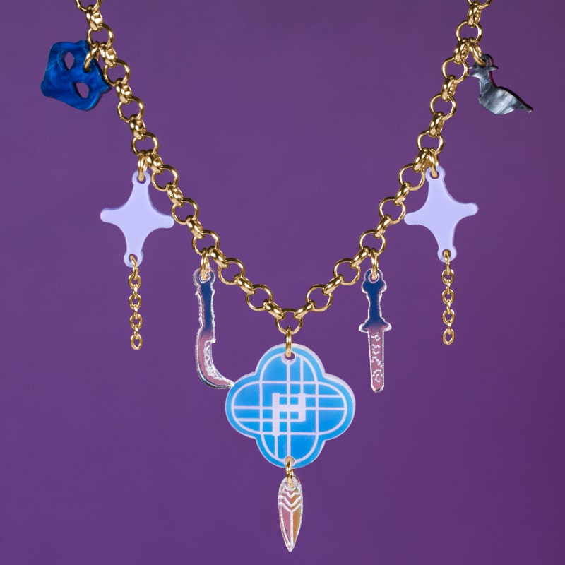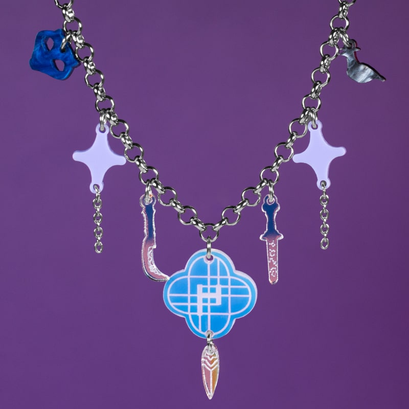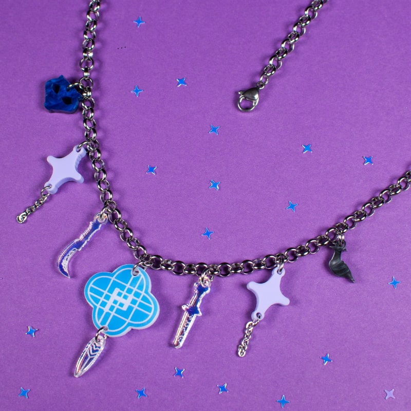 Intercaladas, aparecen estrellas en acrílico lila pastel 💜, que añaden un contraste suave, equilibrando la fuerza de las armas con la delicadeza del color. Estas estrellas aportan luminosidad y un aire mágico, haciendo que el collar sea versátil y fácil de combinar con distintos estilos.
