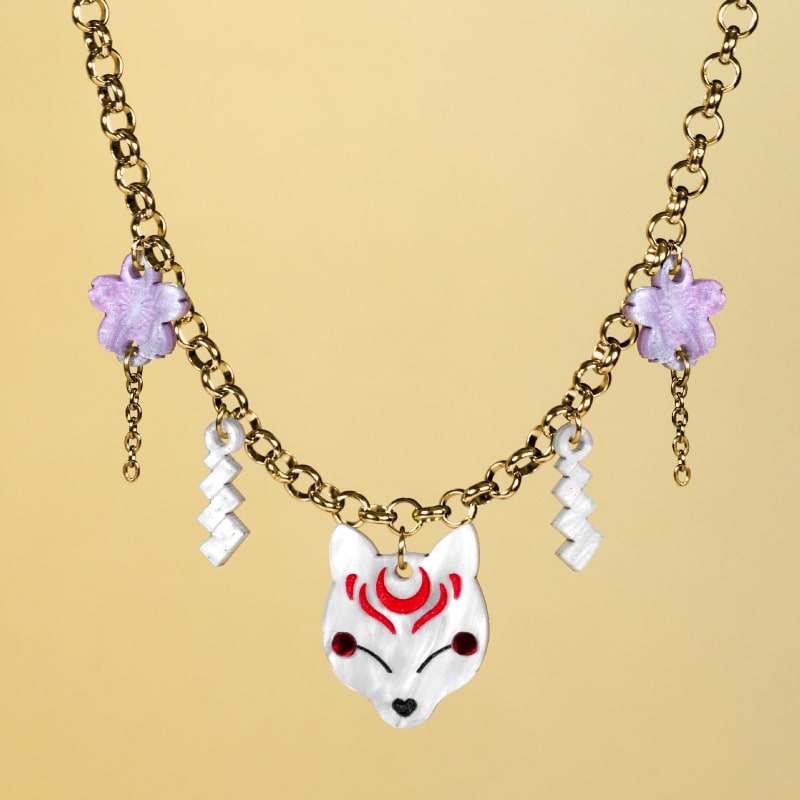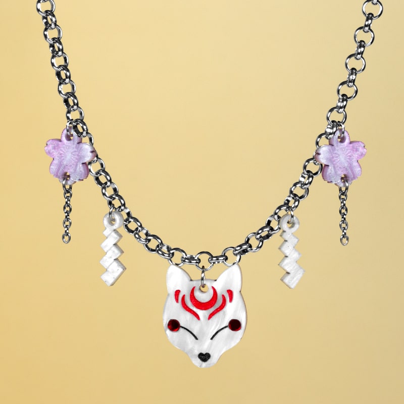 Hecho en acrílico y pintado a mano, cada detalle del collar ha sido cuidadosamente diseñado para capturar la esencia del kitsune, con colores vivos y acabados brillantes que lo hacen destacar. Es ligero, cómodo y perfecto para quienes aman los accesorios únicos con alma.