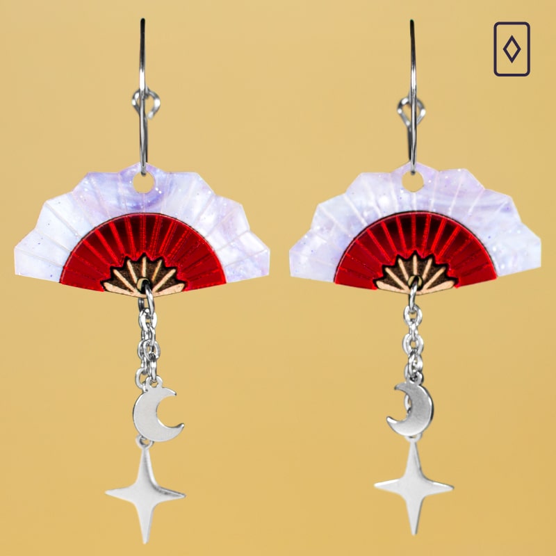 Pero lo más encantador está en el movimiento: de cada abanico cuelgan dos cadenitas finas, de las que nacen una estrella y una luna, creando un sutil efecto de brillo y balanceo al caminar. Un detalle que añade magia, como si llevaras contigo un pedacito del cielo nocturno japonés 🌙⭐.