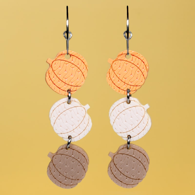 Cada pendiente está formado por 3 calabazas 🎃🎃🎃 con un delicado grabado en efecto crochet, que simula las texturas tejidas a mano. Los tonos pastel —naranja suave, beige y marrón claro ☕— aportan dulzura y elegancia, haciendo de este diseño una pieza versátil y encantadora.