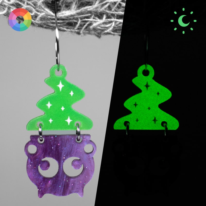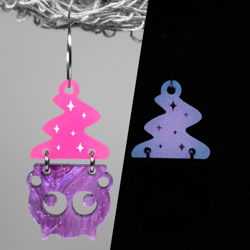 La pieza inferior representa un caldero mágico 🌙 elaborado en acrílico morado nacarado 💜, con un acabado brillante y lleno de profundidad. En su diseño destacan dos lunas crecientes y menguantes 🌙, símbolo de conexión espiritual y energía mística.