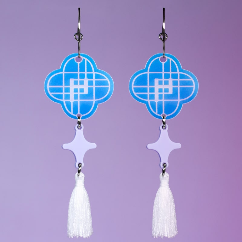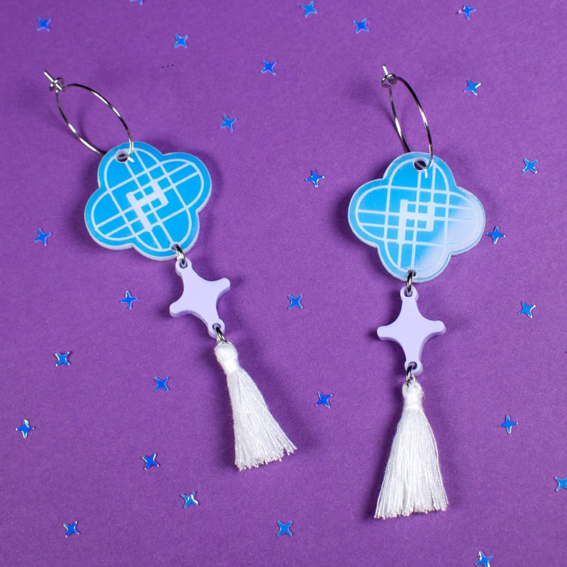 Fabricados en acrílico holográfico 🌈, capturan y reflejan la luz en una explosión de tonos que cambian según el ángulo y el movimiento. En el centro, una estrella acrílica lila 💜 simboliza talento, fuerza y creatividad, evocando el magnetismo de las estrellas del pop asiático.