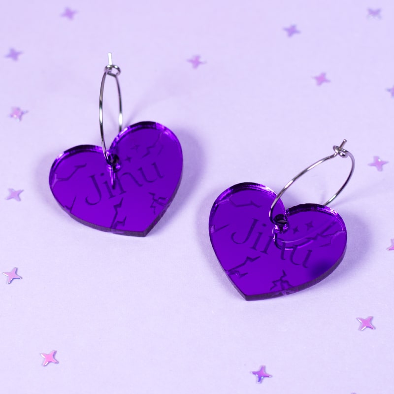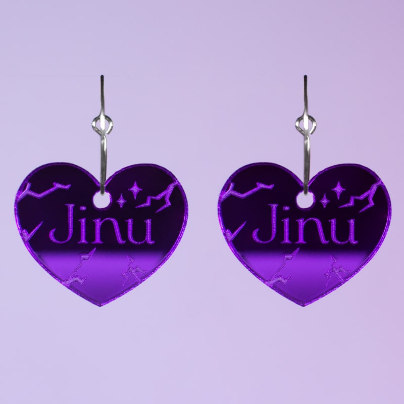 El cuerpo principal es un corazón de acrílico espejo morado 💜, que refleja la luz con un acabado brillante y profundo, perfecto para quienes aman los accesorios con personalidad. En el centro, el nombre “Jinu” aparece grabado con precisión, haciendo de estos pendientes una pieza icónica para fans y amantes del diseño alternativo.
