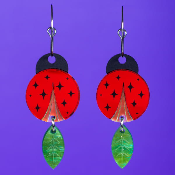 Las mariquitas están elaboradas en acrílico espejo rojo ❤️, un acabado brillante que refleja la luz y hace que el diseño destaque con un color intenso y alegre. Este efecto espejo aporta luminosidad y un toque moderno, mientras mantiene la estética divertida y natural de la pieza.