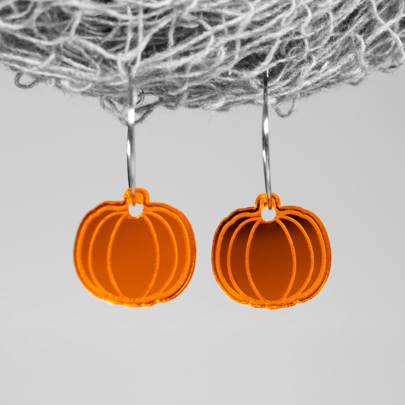Cada pendiente está elaborado en acrílico espejo naranja, un material que refleja la luz con un brillo cálido y vibrante, evocando el resplandor de las calabazas iluminadas en la noche de Halloween. Su acabado espejo aporta un toque elegante y contemporáneo, ideal para combinar con cualquier outfit otoñal o spooky chic 🧙‍♀️.