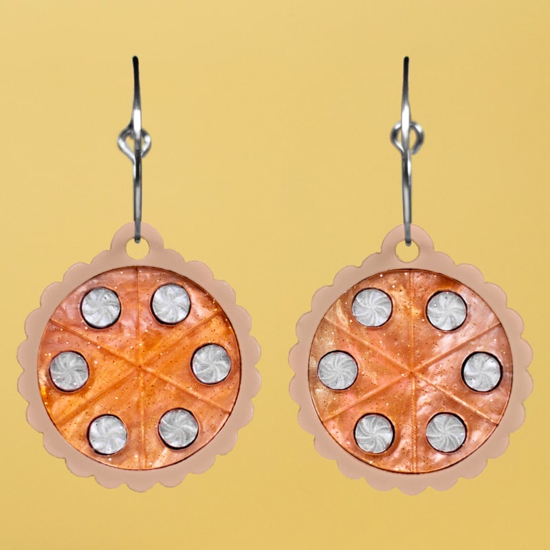 Cada pendiente está diseñado como un mini pastel dividido en 6 porciones 🍰, con un delicado toque de nata en cada sección 🥛. Su combinación de colores incluye naranja intenso 🎃, blanco nacarado ✨ y un borde en marrón claro ☕, creando un accesorio dulce y sofisticado que no pasará desapercibido.