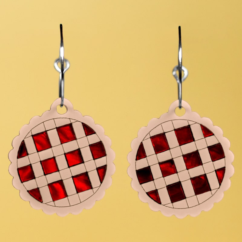 Cada pendiente representa una mini tarta artesanal, con su característico enrejado de masa en marrón claro ☕, acompañado de un relleno en acrílico rojo nacarado 🍓✨, que imita la jugosidad de la frambuesa fresca. El contraste entre la textura nacarada y los tonos tierra crea un accesorio llamativo y encantador, perfecto para destacar en cualquier ocasión.