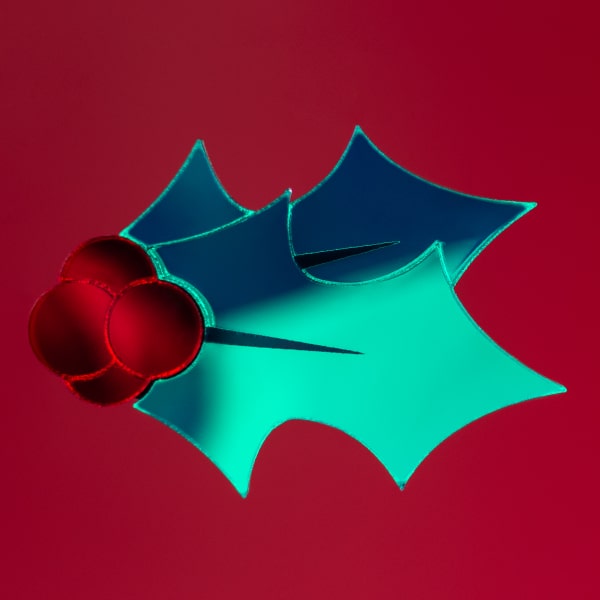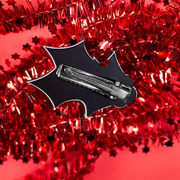 Fabricada en acrílico espejo rojo y verde, la pinza refleja la luz de manera preciosa, creando destellos que recuerdan a los adornos clásicos del árbol de Navidad. El verde espejo aporta frescura y viveza, mientras que el rojo espejo añade calidez y espíritu navideño, formando juntos la silueta característica del muérdago con un acabado moderno y encantador.